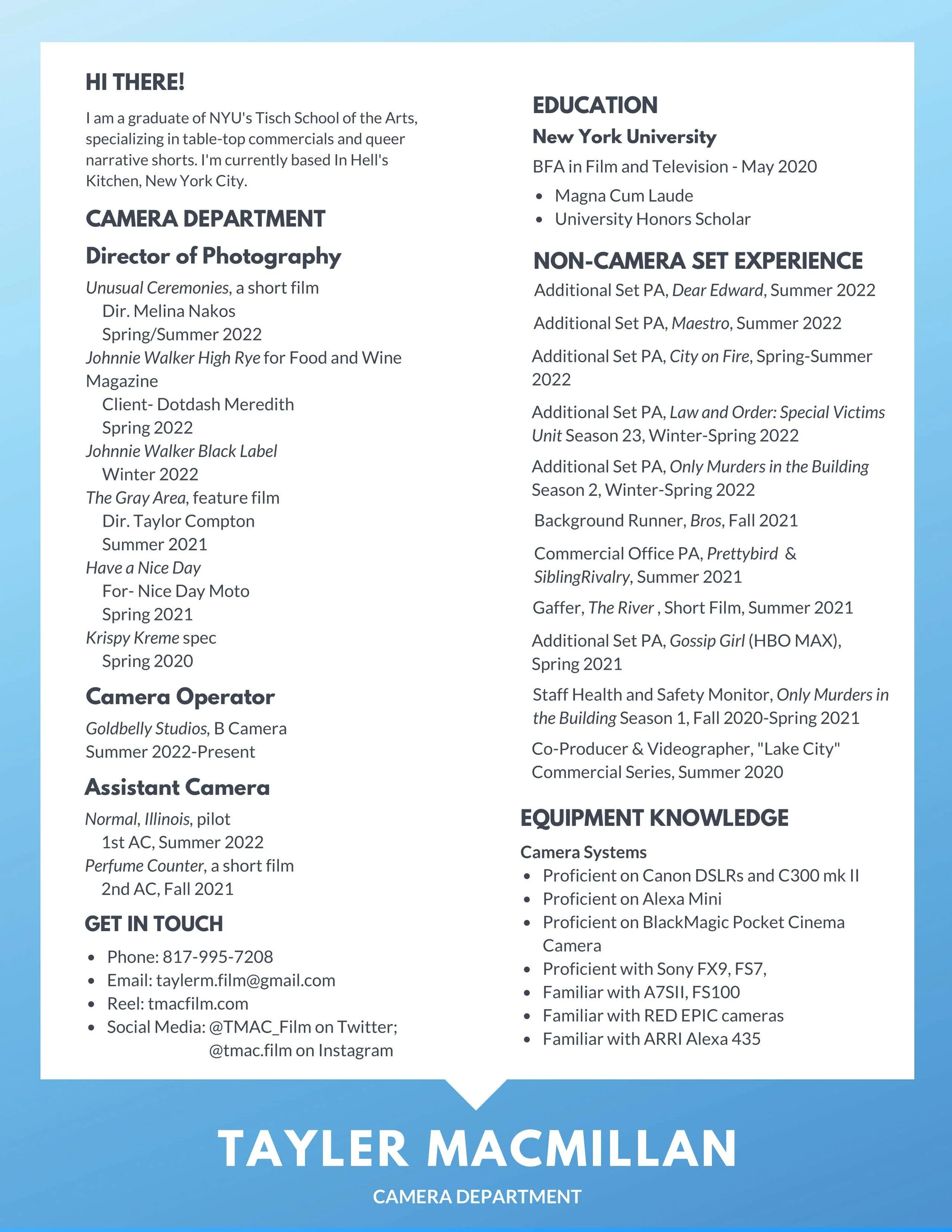 Since graduating from New York University’s Tisch School of the Arts and receiving my BFA in Film and Television Production as part of the Class of 2020, I’ve worked as a freelance director of photography & production assistant on projects of all scales and sizes.